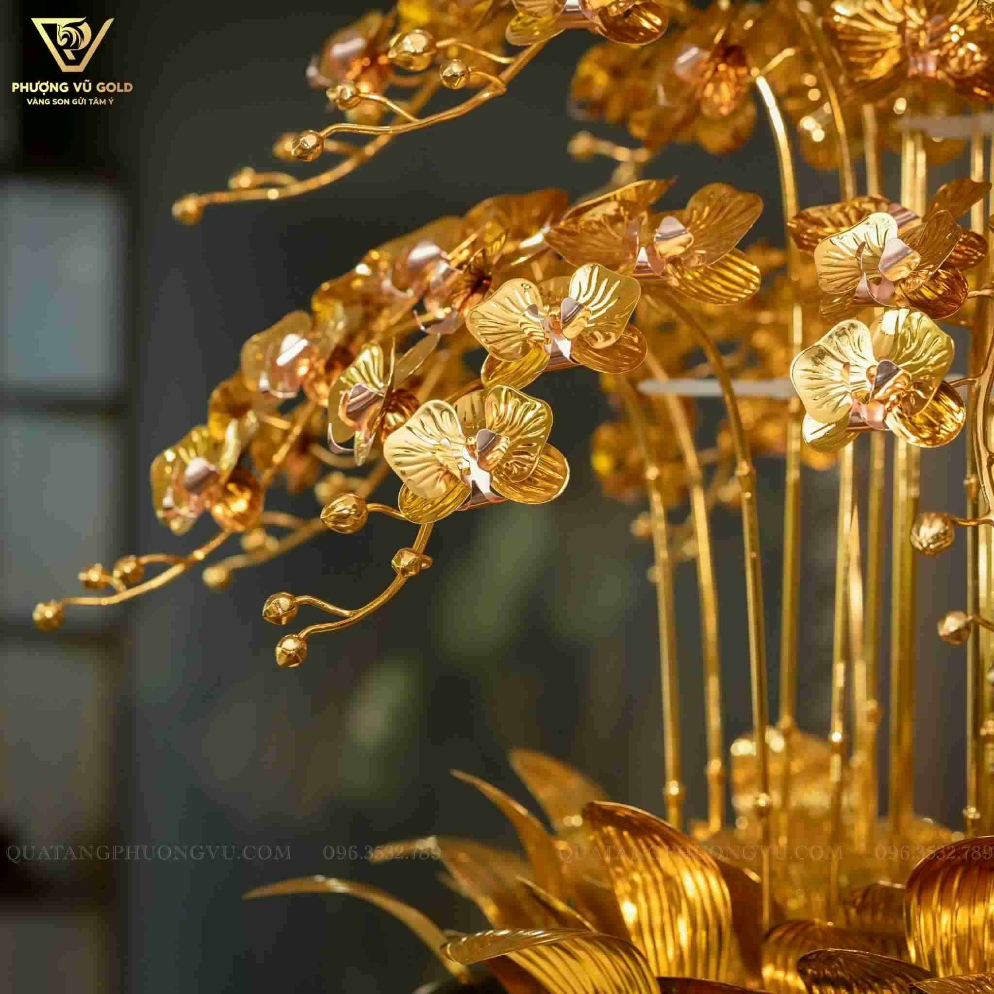 Được chế tác từ chất liệu đồng cao cấp phủ vàng 24K, từng đường nét của cánh hoa được chạm khắc tinh xảo, tỉ mỉ – tái hiện trọn vẹn hình ảnh hoa lan kiêu sa, tượng trưng cho sự phú quý và viên mãn.