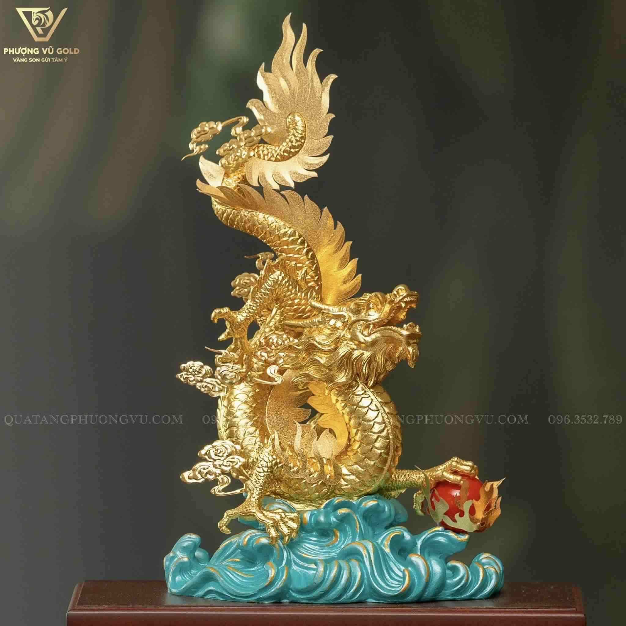 Ánh vàng sang trọng của lớp mạ 24K được chế tác tinh xảo trên từng chi tiết vảy rồng, đầu rồng hiên ngang vươn cao, hàm chứa năng lượng chiêu tài – trấn trạch – tụ lộc mạnh mẽ.