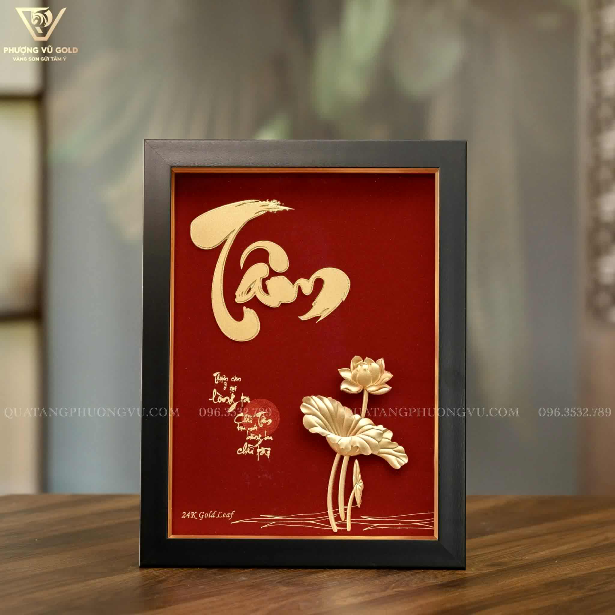 Tranh Chữ Tâm Dát Vàng 24k Nền Đỏ – Quà Tặng Ý Nghĩa | Phượng Vũ Gold